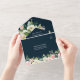 This all in one wedding invitation card features a hexagon shape surrounded by painted watercolor flowers in blush pink, white and green foliage on a navy blue background, a wedding invite with an rsvp postcard for your guests to cut off and send back. For more advanced customisation of this design, please click the "customise further" link. Matching items are also available.