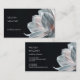This professional business card features a dramatic high-contrast design with a large, detailed silver-gray floral bloom against a deep black background. Subtle rose-tinted highlights within the petals add a touch of warmth to the monochromatic palette. The clean white typography provides excellent readability for the wedding planner title and contact details. This card is ideal for event coordinators, floral designers, or professionals in the luxury wedding and bridal industry seeking a sophisticated and modern aesthetic.