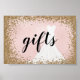 Sparkling rose gold (faux) glitter frame splattered all around with a textured effect blush pink background and our exclusively ours mermaid wedding gown. Gifts sign.
