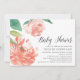 Chic baby shower invitation features watercolor peony flower illustrations in peach and blush pink, accented with lush green leaves. Personalise with your baby shower details aligned at the right. Cards reverse a subtle peachy blush watercolor wash background.