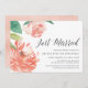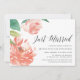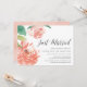 Elegant floral post-wedding brunch invitations feature watercolor peonies and greenery in chic blush pink and peach. Customise with your wedding brunch details aligned at the right, embellished with "just married" in chic calligraphy script. Invitations reverse to a subtle watercolor wash pattern in peachy blush pink.