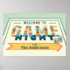 Game Night Poster featuring a fun typography of "Game Night''. This designs include elements of blue, yellow, red and orange, a game board background, dice, game pieces, game cards, and elements inspired by board games. Products include a template for personal customisation.