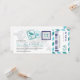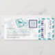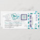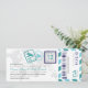 A boarding pass inspired ticket invitation with fun passport stamp details and airmail stripes. Shown in shades of Aqua, Teal, Navy, Dark Grey and Light Grey. Back side includes extra space for any hotel, travel or website information.