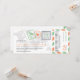 A boarding pass inspired ticket invitation with fun passport stamp details and airmail stripes. Shown in shades of Peach, Mint, Dark Grey and Light Grey. Back side includes extra space for any hotel, travel or website information.
