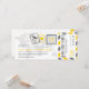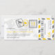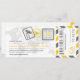 A boarding pass inspired ticket invitation with fun passport stamp details and airmail stripes. Shown in shades of Sunshine Yellow, Dark Grey and Light Grey. Back side includes extra space for any hotel, travel or website information.