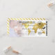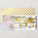 Boarding pass wedding ticket featuring a photo of the happy couple, a gold foil destination world map, compass, aeroplane, and a personalised wedding template.