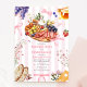 Boards and bows bridal shower theme with Illustration of a charcuterie board surrounded by pink bows, fruit, cheese, bread, and honey with floral designs. Background is pink stripe.