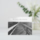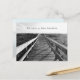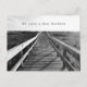 Postcard new address announcement with black and white photography and beach theme. A wooden boardwalk is the image on the front with a line of text along the top. On the back an ocean scene is the background for more text to include names and new address.