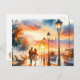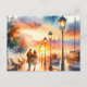 It's reminiscent of an old romantic movie. A couple is strolling along a boardwalk at sunset.