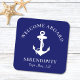 Chic and modern nautical-themed coasters for your boat's guests that feature a white illustration of an anchor on a navy blue background. You can personalise the "Welcome Aboard" text and your boat's name and location in elegant white typography.