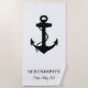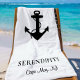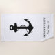 A chic modern nautical-themed beach towel for your boat that features a black illustration of an anchor. Personalise your boat's name and location in elegant typography and script.
