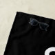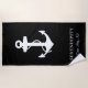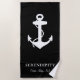 A chic modern nautical-themed beach towel for your boat that features a white illustration of an anchor on a black background. Personalise your boat's name and location in elegant white typography.