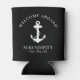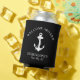 A modern nautical-themed can cooler for your boat that features a white anchor on a black background. You can personalise the "Welcome Aboard" text and your boat's name and location in elegant white typography and script.