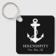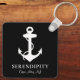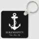 A chic modern nautical-themed keychain for your boat featuring a white anchor on a black background. Personalise your boat's name and location in elegant white typography and script.