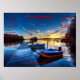 The full Desiderata by Max Ehrmann: Go placidly amidst the noise and haste.is a photo of a beautiful shot of two small boats tied to a dock on the sea shore with a wet wooden plank dock going away from you and in the back ground you can see a silhouette of a tree to the right and beautiful blue purple and white sky light. The full Desiderata is a popular poem The well-loved poem written by Max Ehrmann in 1872-1945 is beautifully illustrated with the glowing colors reflecting off of the water.