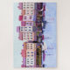 Boat harbour with sailboats moored along a waterfront of shops and cafes. Red, blue and lavender colours. Art by REIFSNYDER©