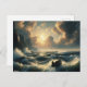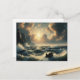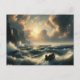 Dramatic and turbulent ocean waves surge beneath a glowing, cloud-filled sky as two individuals row a small boat through the rough waters. Cliffs rise in the background, and birds can be seen flying against the backdrop of the setting sun.