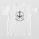A custom designed nautical boat anchor, gold style laurel leaves and a gold star with and your personalised name or boat name on a boys white t-shirt. Several colours to choose from. Makes a great gift.