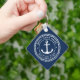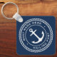 Keyring for your boat featuring a white, elegant anchor and rope emblem with your custom boat name and hailing port on a dark blue background.
