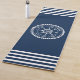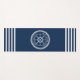 Yoga mat featuring a white, elegant ship's wheel and rope emblem with custom boat name and hailing port (or other custom text) on a dark blue background. At the ends are white stripes.