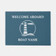 Your Personalised Boat Name and Greeting with a classic Nautical Lighthouse on a Smoke Blue Custom Doormat.