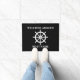 Your Personalised Boat Name and Greeting with a classic Nautical Ships Wheel on a Custom Black and White Doormat.