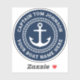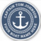 Sticker featuring an anchor inside a rope border with customisable name and boat name wrapped around the circular border. Customisable colour and font.