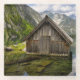 Glass photo coaster with a wooden boathouse cabin inside Obersee lake surrounded by beautiful high Alps mountains in a Bavaria landscape in the south eastern tip of Germany, near the border with Austria.