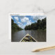 A boat noses down a river in the Amazon jungle under puffy clouds in a blue sky.