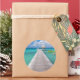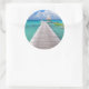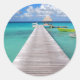 Round souvenir photo sticker with multiple boats at a jetty in the clear turquoise lagoon of a tropical island in French Polynesia in the Pacific ocean.