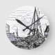 The clock did not take as long to arrive as I thought it might and was extremely well packaged. I didn't do the measurements so I didn't realize it is a little smaller than the average clock but that does not matter (just make sure you check if that's important to you).It is really nifty! It seems very solid and well made not flimsy at all. It has been going well and has kept good time in its few weeks on my wall. Nice product. Gets noticed too! Nicer in real life than the picture but true to the picture