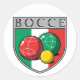 This colourful Bocce graphic features three Bocce balls in a shield over the Italian flag of green, white and red with the word Bocce.