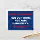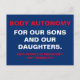 Design description: Simple red and white capital text on a blue background that reads, "Body autonomy for our sons and our daughters. Anti-choice is misogyny, not morality."