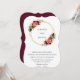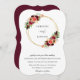 Beautiful watercolor bohemian style flowers, feathers and foliage in shades of burgundy, violet, red, peach, blush and green, adorned on layered golden hoops, wedding invitation. Back of card features burgundy Bordeaux colour.