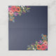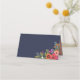 Navy blue wedding place cards with floral arrangements in red, orange, pink, and olive green and blue. Add the guests' names and the table numbers by hand, perhaps in a silver or white gel pen!