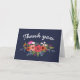 Dark blue thank you greeting card with a colourful flower arrangement of roses, pansies, and daisies in orange, pink, white, and blue.