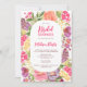 Bohemian bright floral arch script bridal shower invitation featuring pretty hand painted bright and bold modern flowers mix a vintage feel, with coral peonies, purple flowers, pink roses and greenery with a botanical boho themed bridal party. With a modern script typography and neon pink.