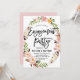 Boho-inspired engagement party invitation featuring watercolor feathers and flowers wreath with pink back colour. Elegant and whimsical, perfect for spring events. This design is available for other events.