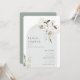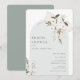 Bohemian Floral Arch Bridal Shower Invitation. White watercolor flowers and delicate green foliage frame on sage green backgrounds.