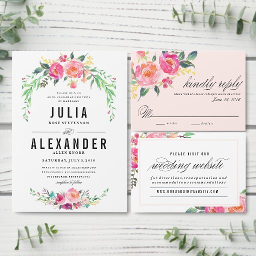 Our Bohemian Floral Wedding Invitation Suite is framed with gorgeous florals, modern typography and soft, delicate roses.