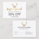 Coordinates with the Bohemian Gold Antlers with Flowers Business Card Template by 1201AM. An illustration of deer antlers in faux metallic gold is combined with a bouquet of flowers to provide a bohemian aesthetic on this refer-a-friend promotion card. This double-sided card allows ample room on the backside for your contact info. Great for boutiques and salons to encourage referral business. Update the promotion for your own unique offering.