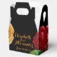 A modern bohemian wedding design on a black background with red and yellow roses creates a custom gable favour box with a template area for your names and date. By changing the text you can use the favour box for other occasions.