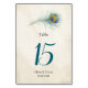 Bohemian wedding table numbers with peacock feather and teal wording. Great for boho weddings and other vintage style events.
