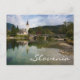 Postcard of a Bohinj lake landscape with calm water and reflection of St. John the Baptist church and the stone bridge in Ribcev Laz, Slovenia, at the start of autumn season with the text: 'Slovenia'.