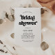 This simple and boho black and white bridal shower invitation features retro typography on a white background.