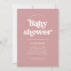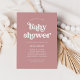 This simple and boho baby shower invitation features white, retro typography on a dusty rose pink background.