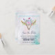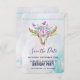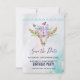Save the date flat card for a birthday party. Designed with a turquoise and pastel watercolor background. A boho chic animal skull with a floral bouquet upon its head and little butterflies fluttering about. A cute decorative border with little teardrop shapes in light blue.