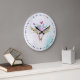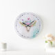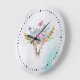 A clock with a turquoise and pastel watercolor background. A boho chic animal skull with a floral bouquet upon its head and little butterflies fluttering about.