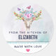 Kitchen stickers with with a turquoise and pastel watercolor background. A boho chic animal skull with a floral bouquet upon its head and little butterflies fluttering about. A cute decorative border with little teardrop shapes in light blue. Text says From the kitchen of <Personalised Name> Made with love with a cute pink heart.