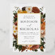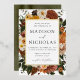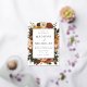 Elegant autumn wedding invitations featuring your wedding details inside of a thin gold foil frame with watercolor flowers and greenery in muted autumnal colours of ivory, orange, mustard gold, olive green, dusty rose, and brown. The fall floral wedding invitations reverse to display a rich olive green watercolor background. Designed to coordinate with our Boho Autumn Floral wedding collection.